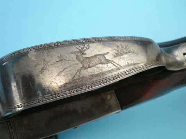 engraving and foliate scroll details. Push-forward front trigger opening. Rifle barrel