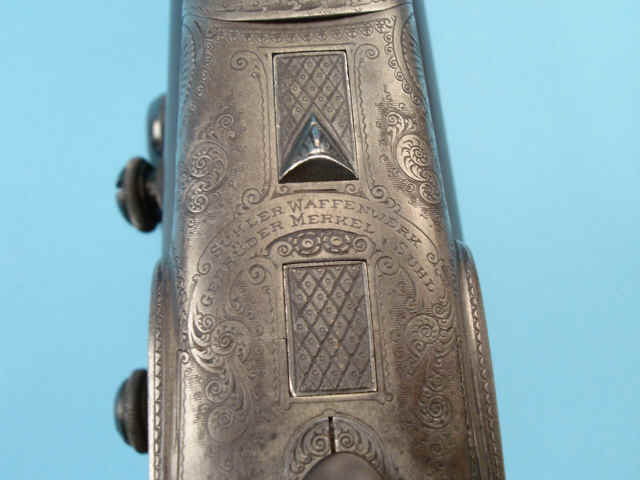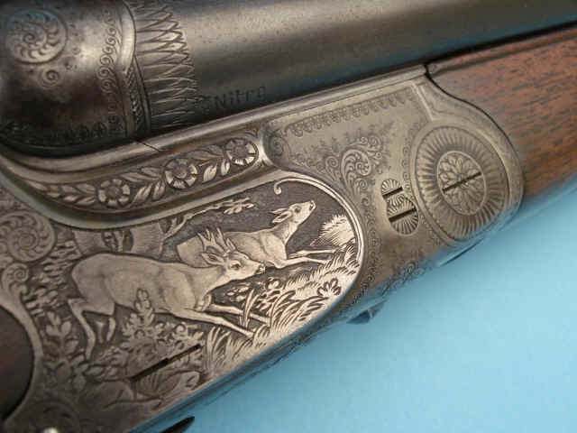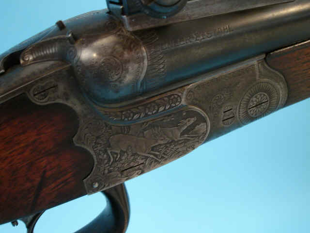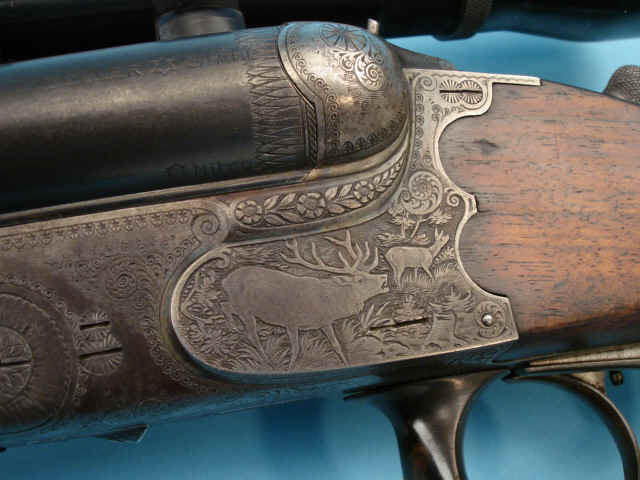 flat rib with automatic rising rear sight. Case-hardened sculpted and scalloped Boxlock