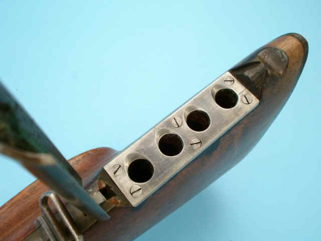 gripcap. Cheekpiece. Cartridge trap with hinged lid in butt. Finely checkered splinter