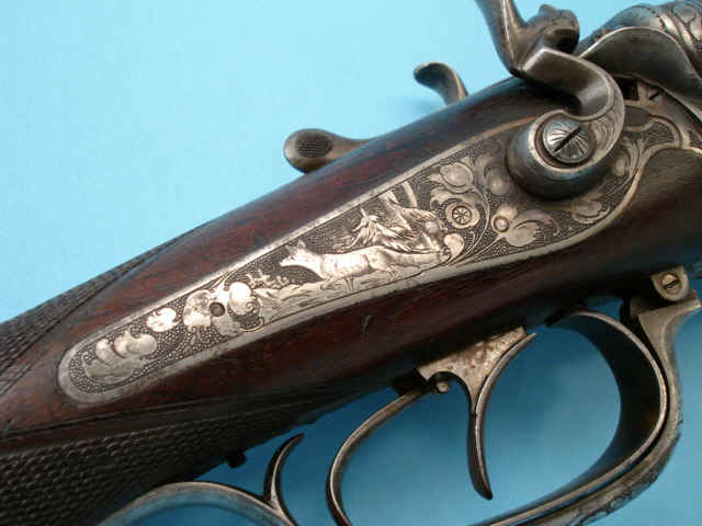 engraved on barrel breech; profusely floral scroll and border engraving, and with game