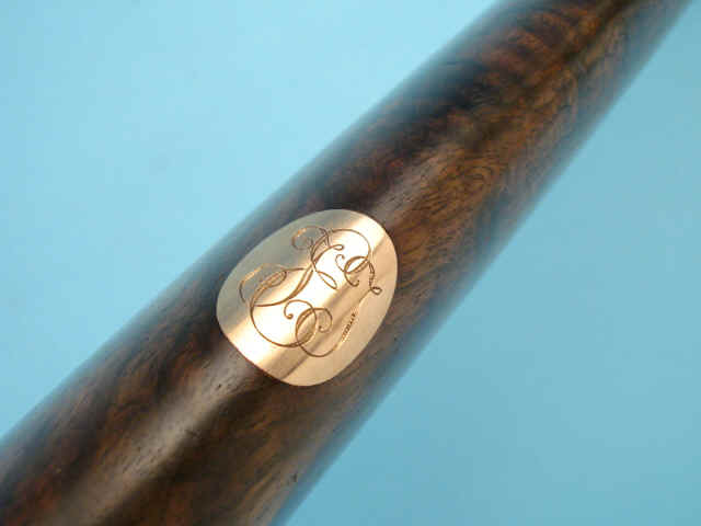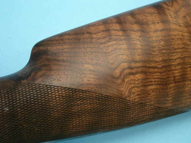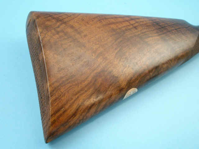 straight-grip stock of figured walnut. Gold oval with initials. Drop points. Checkered