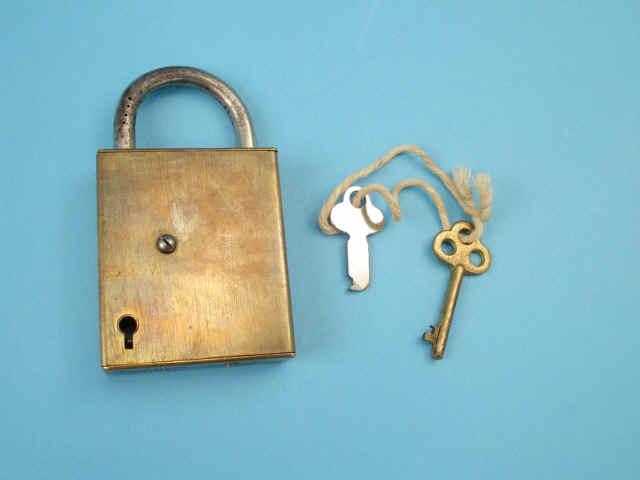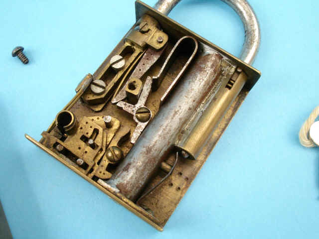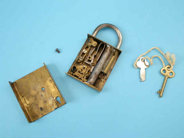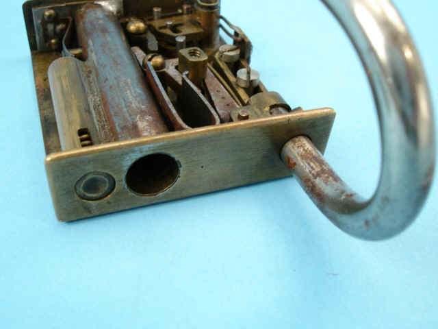 .38 caliber, the brass padlock alarm gun with complicated lock mechanism that fires the