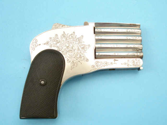 5mm, 1 1/2-inch barrel formed in a vertical stack, engraved at muzzles with scrolls,