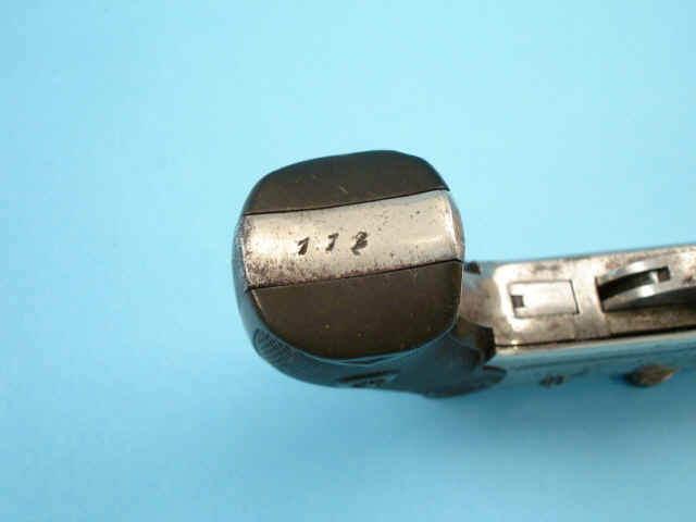 Serial no. 172, .22 caliber, 2-inch hinged 4-barrel cluster. Fire-blued latch spring.