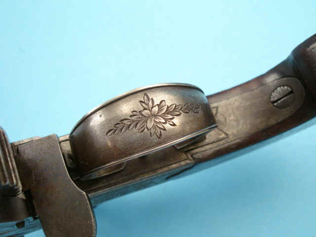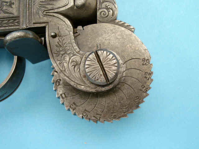 Ratchet-type calibrated wheel with scroll-engraved top and side languets. Boxlock