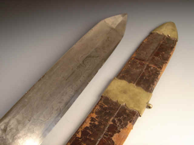 dark patina to pin securing grip to tang. Crack in grip on one side only. Scabbard very