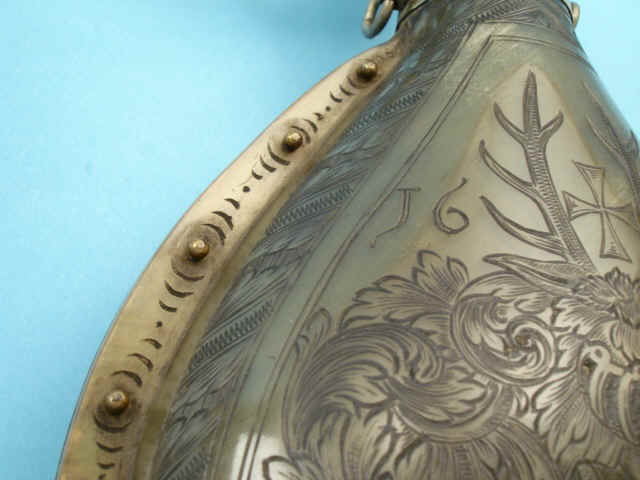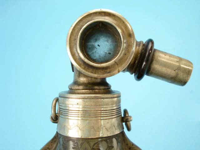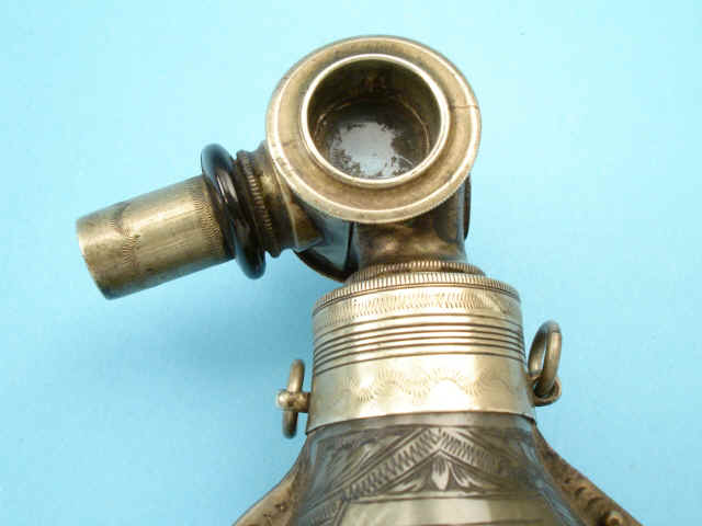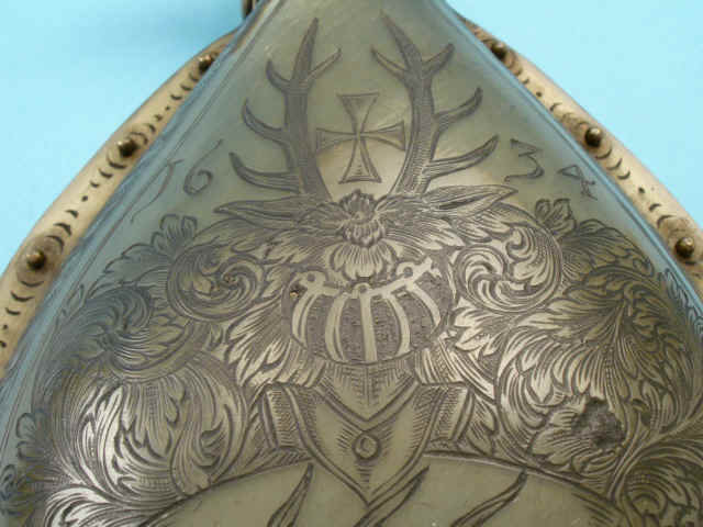 silver spout with horn ring. Four ring mounts. While dated 1634, this flask was