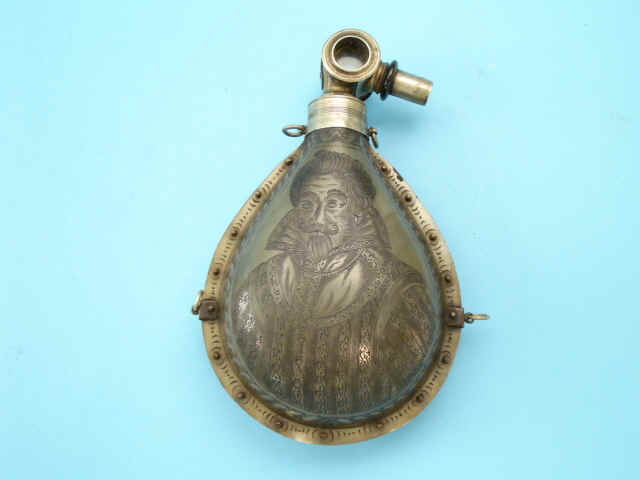 17th-Century gentleman, the reverse with a coat-of-arms and date 1634. Edges of flask