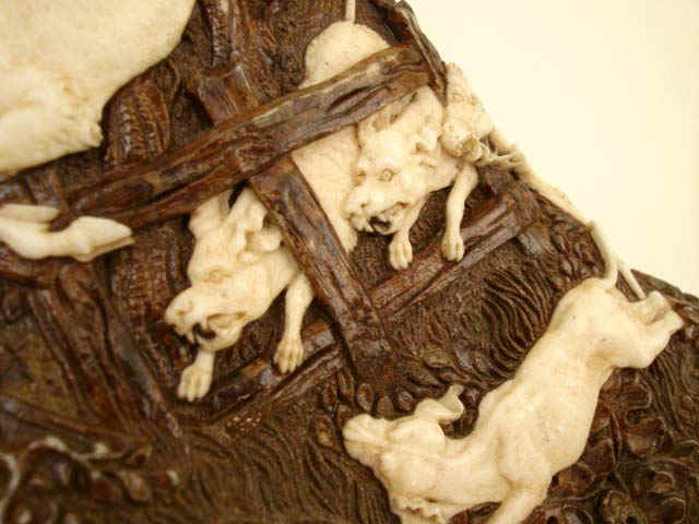 ring mounts, the centers with carved vignettes of wild boar and dog heads. Top of flask