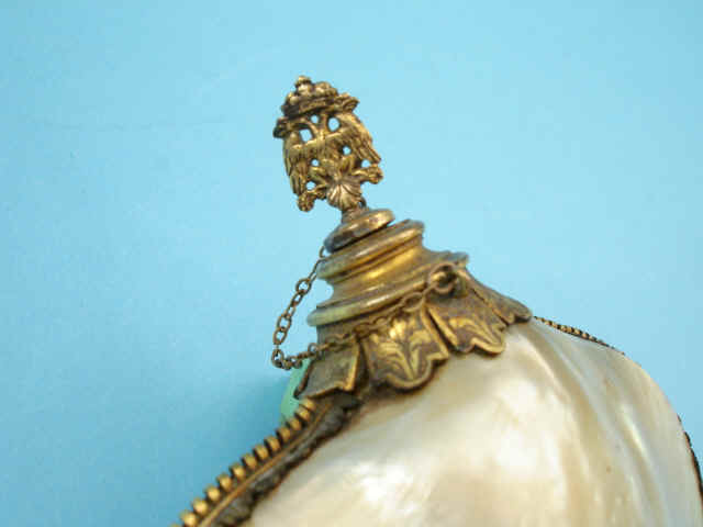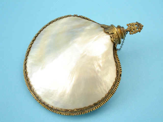 The unique and ornate priming flask, the body formed of two shells of pearl, mounted in