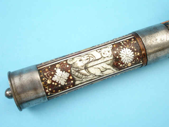rod with spool finial. Butt of gun with concealed 18-1/2-inch spike dagger of diamond