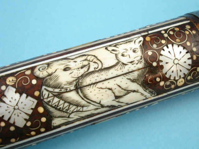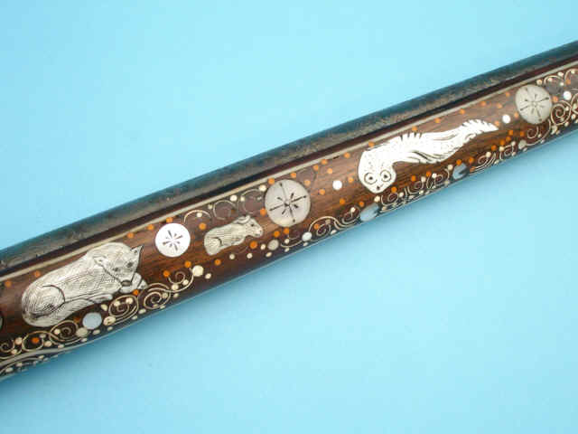 inlaid borders. Profusely inlaid fruitwood stock, having scrimshawed ivory animals, dyed