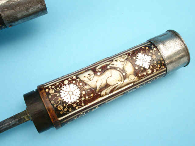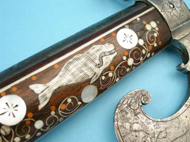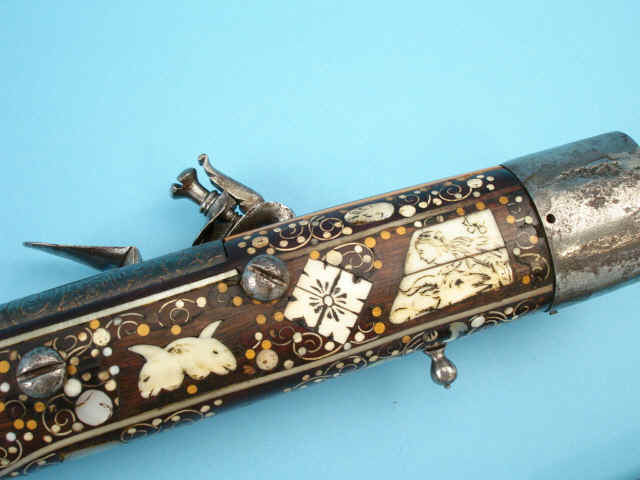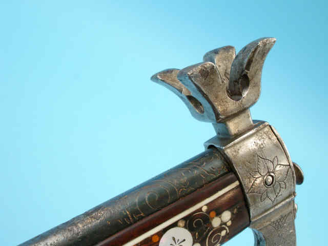 ivory and pearl spots and ivory scrolls. Muzzle mounted with scroll-type ax head engraved