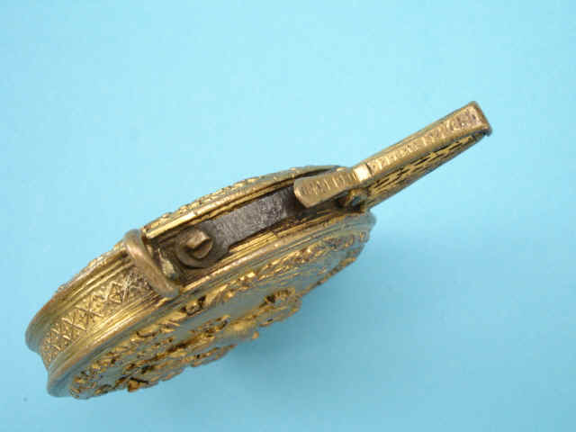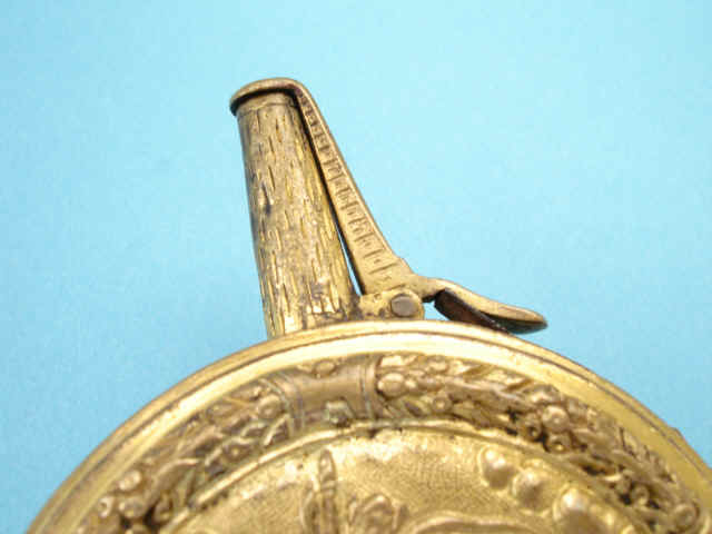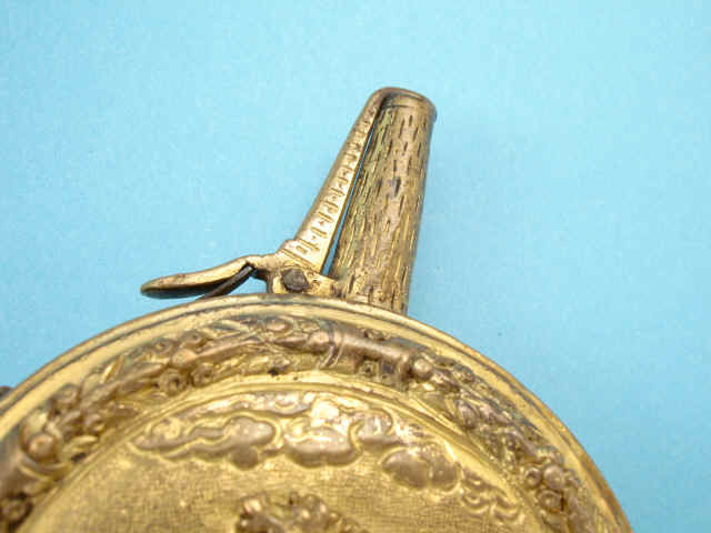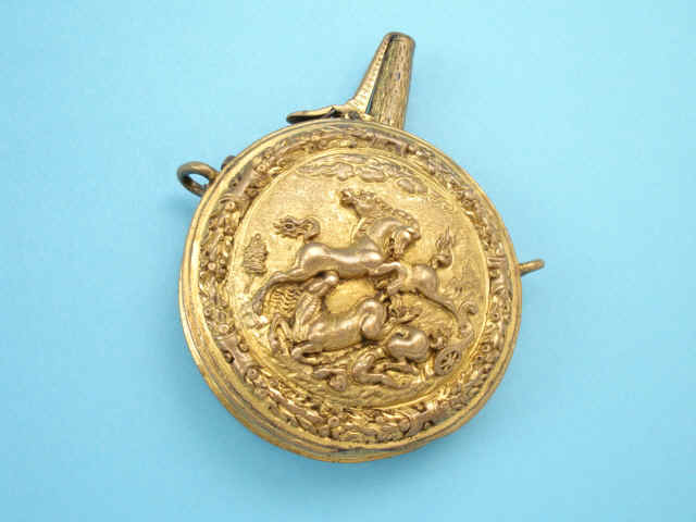 The gilt copper pistol powder flask of circular form, the front with finely engraved