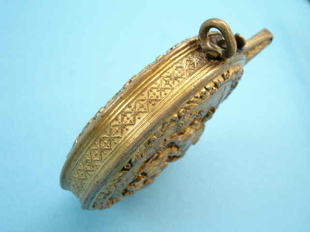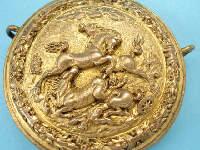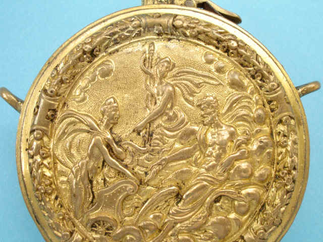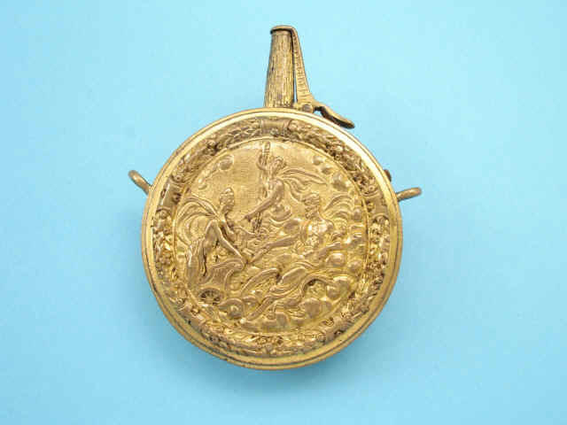 Rare German Gilt Copper Circular Pocket Powder Flask, Augsburg, c. 1600