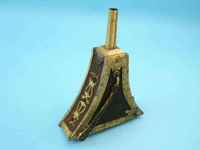 floral escutcheons. Curved belt hook. Engraved gilt copper spout with faceted square base