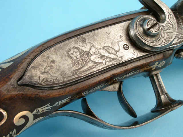counterplate depicting a hunting scene; the triggerguard, acting as a release for the