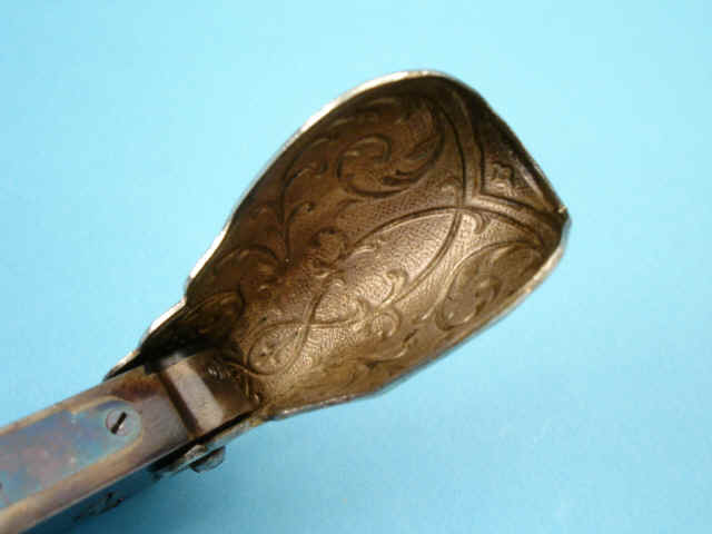 Fire-blued grip release. Nickel-plated die-struck brass sheet folding grip with embossed