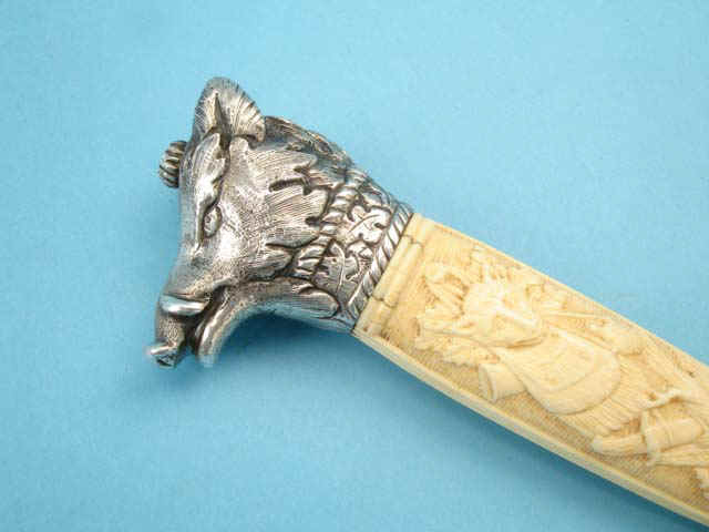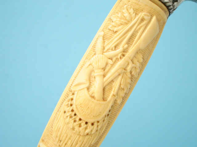 One-piece ivory grip intricately engraved with panoplies of hunting arms and dead game.
