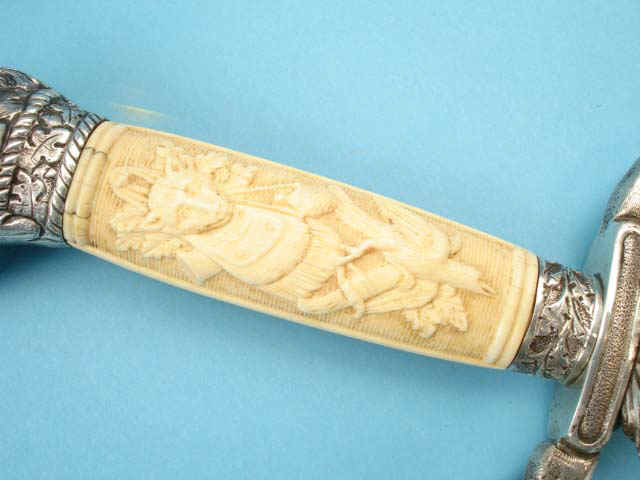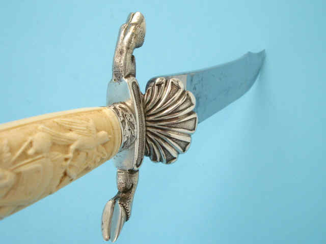 German-style silver crossguard with hoof quillons and shell-type guard, the reverse