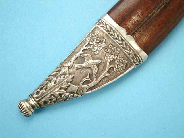 scabbard with cast silver mounts depicting birds in flight among grove of trees. Cast