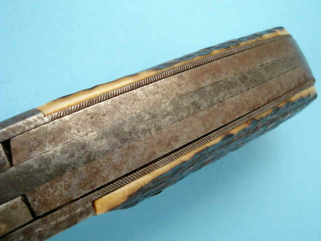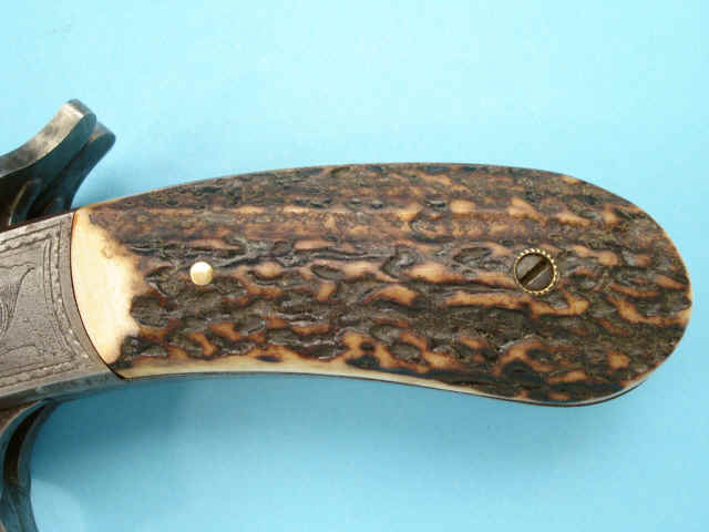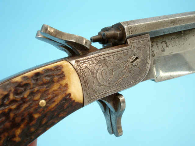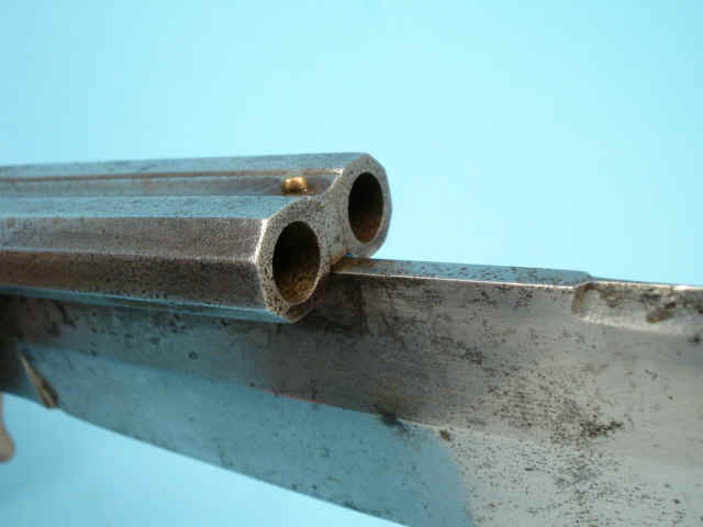 Unmarked 8-inch clip-point blade with 4 1/4-inch false edge. .32 caliber, side by side