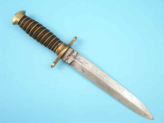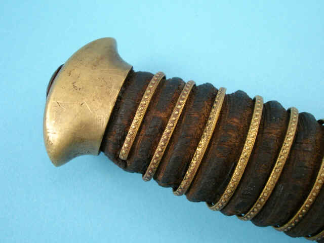 of sharpening present. Brass with light age patina. Grip with brass wire re-wrap. No