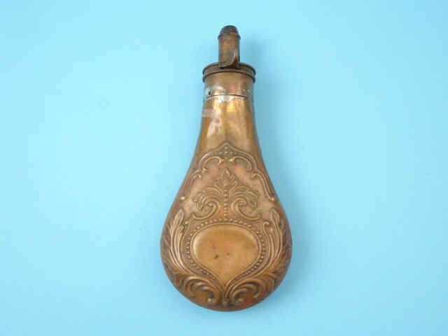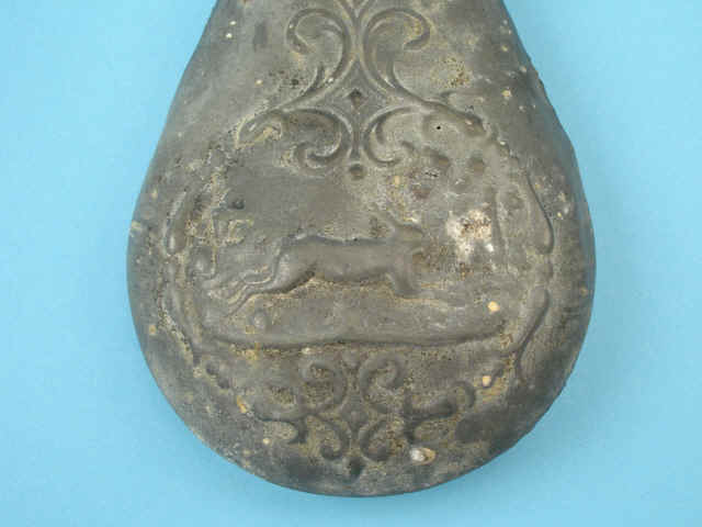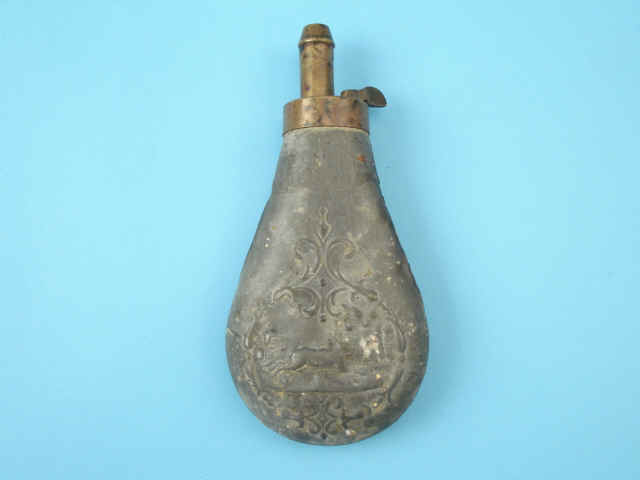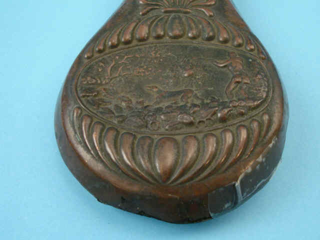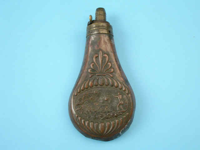 [Riling #527]. 4) Tin-finished panel flask with hunter and hare. Brass charger.