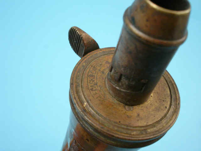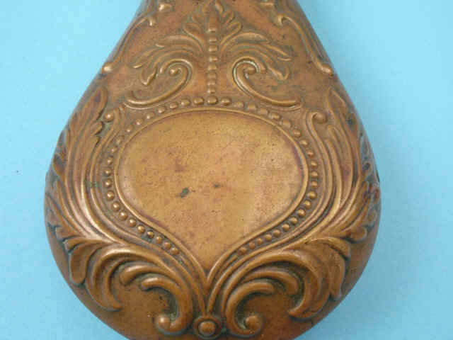 2) Plain brass flask with charger marked: Patent. 3) Panel flask with floral motifs