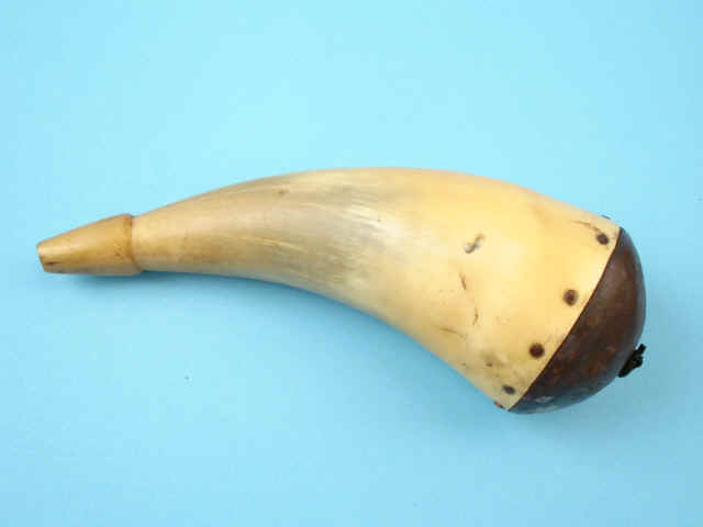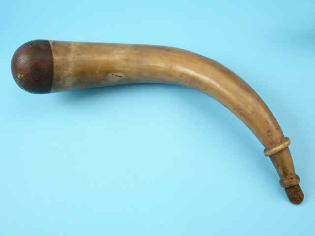 plain horn with carved spout, wooden stopper and plug. 5) Very small plain pistol horn wit