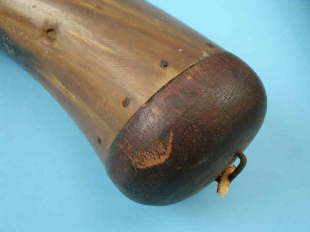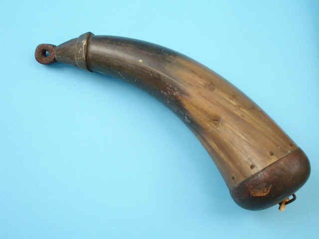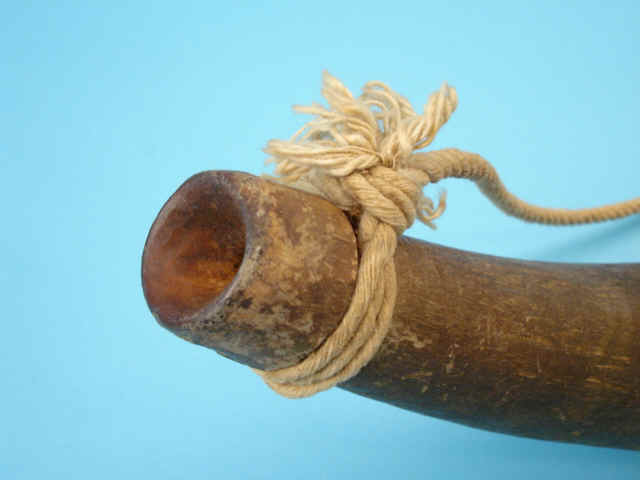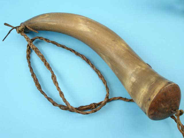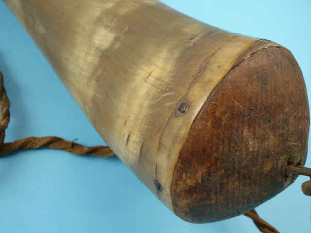 plain horn with carved spout and wooden plug. No stopper. Leather thong. 3) Large hunting