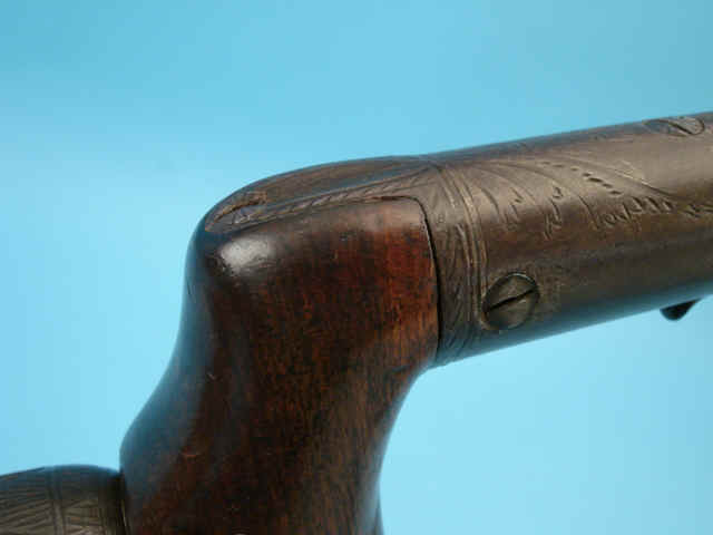 hammer. Scroll-engraved frame. One-piece walnut grip with screw-on varnished walnut