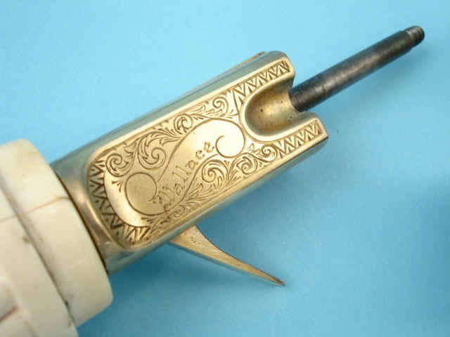 trigger. 5-inch spike dagger thread-mounted on end of cylinder arbor. Carved and fluted