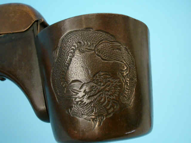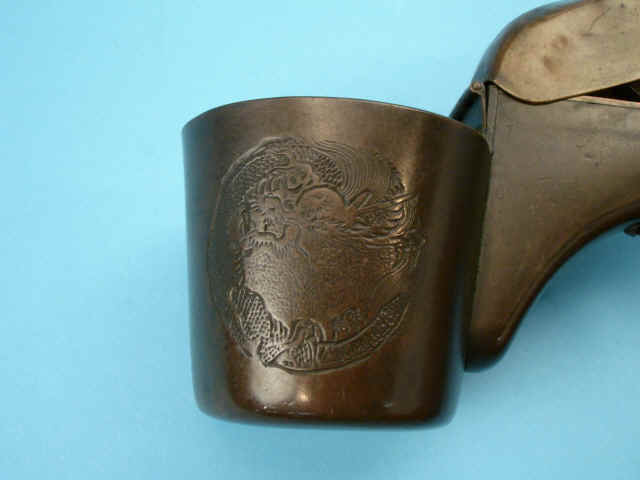 hole for attaching a firing string. Bronze alloy cup engraved with dragon motifs. Threaded