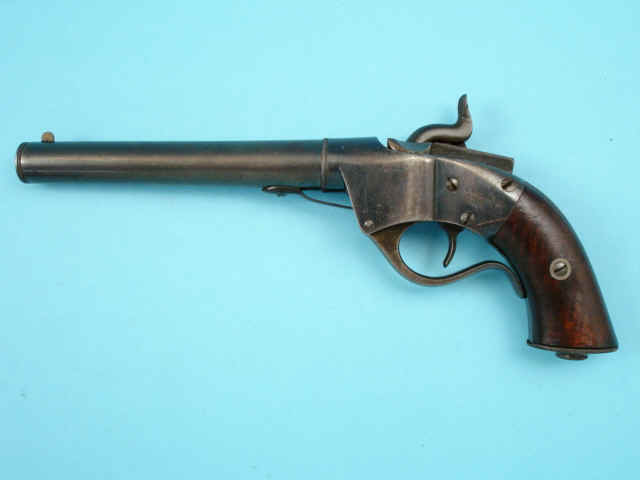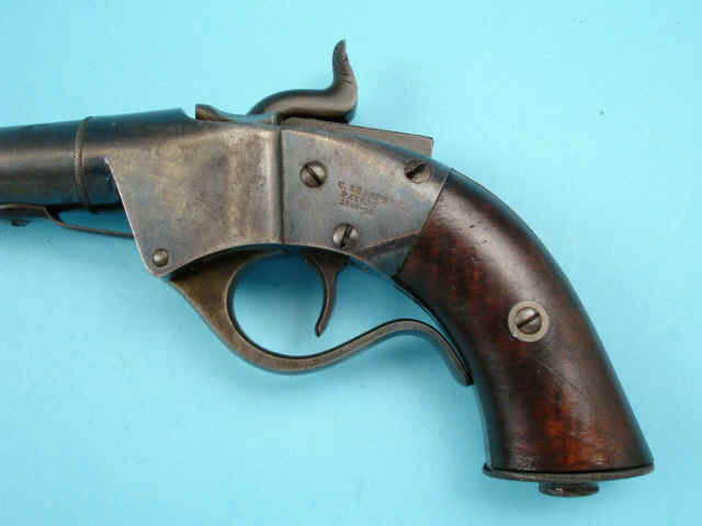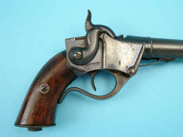 case-hardened lever and breechblock; varnished walnut grips. Maker and address marking on