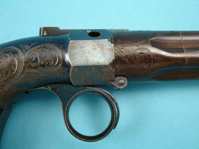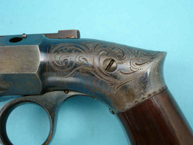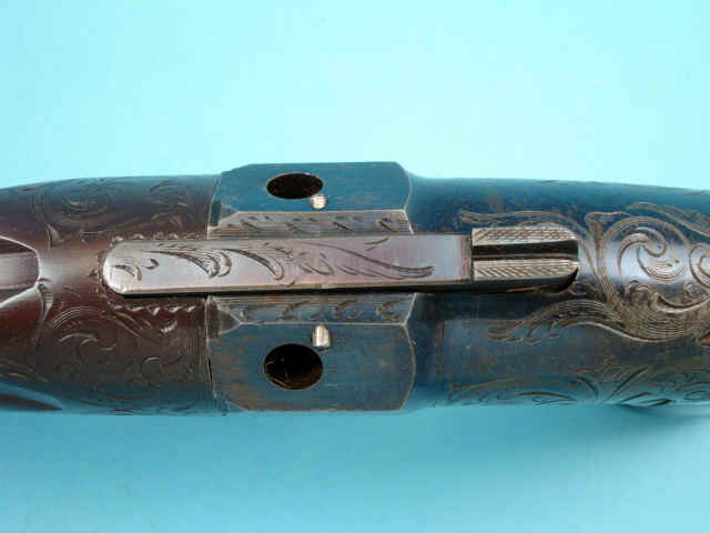 engraved frame, barrel breech and backstrap; blued, with browned barrel cluster; varnished