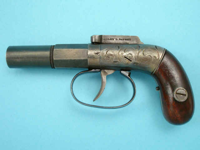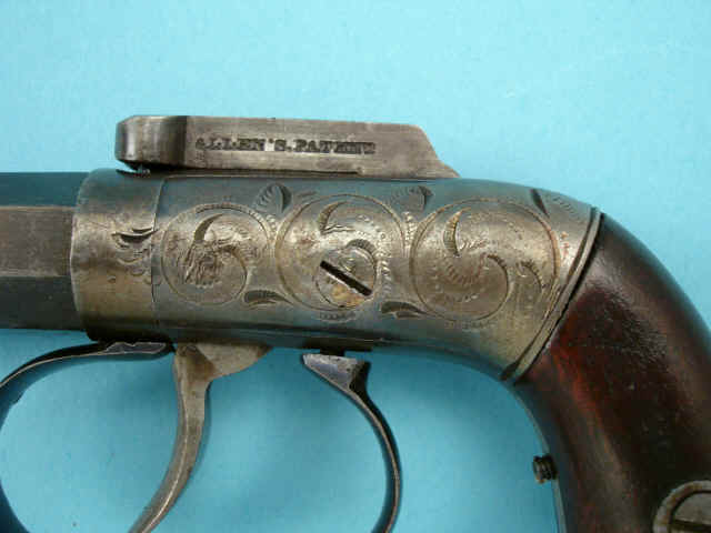 barrel; scroll and engraved frame; blued, with varnished walnut grips. ALLENS PATENT on