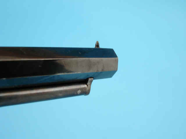 4-inch octagonal barrel, with maker and address marking on top; blued with silver-plated
