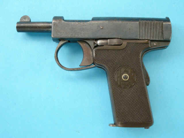 Serial no. 3703, .32 A.C.P. caliber, 3 1/4-inch barrel. Blued finish. Checkered hard