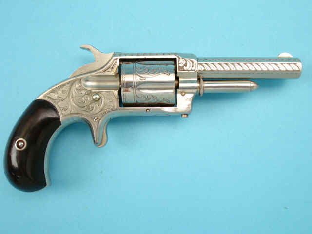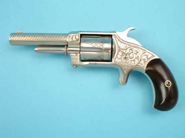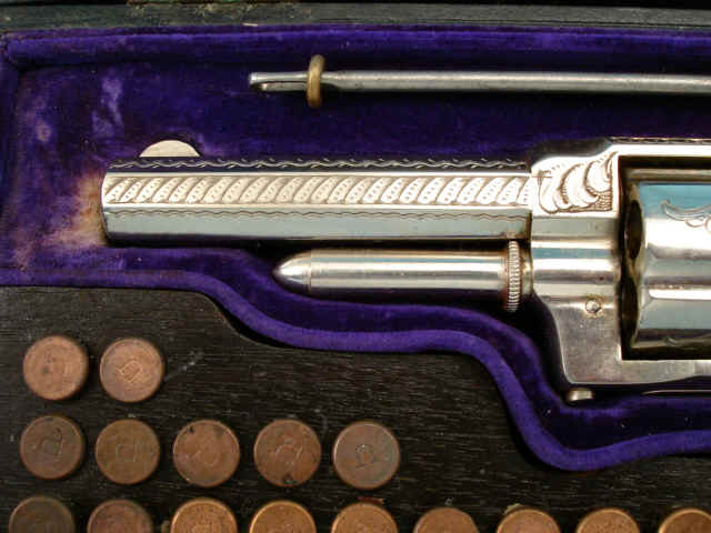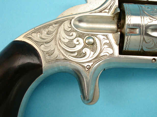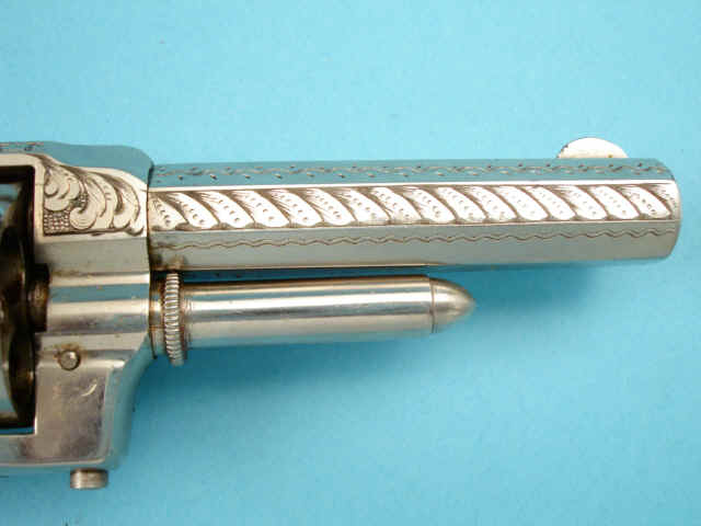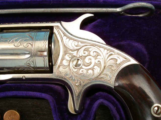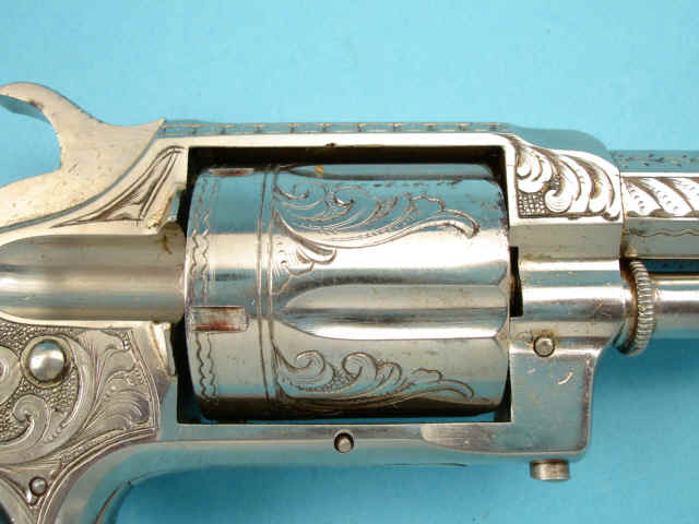 patent marking on top; nickel-plated, with scroll and border engraved frame, and cylinder;