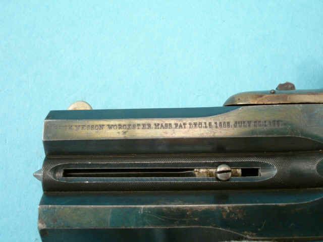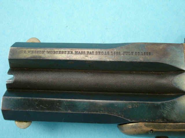 maker, address and patent date markings in single line on left side of each barrel; blued,
