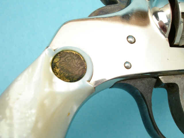 triggerguard; mother-of-pearl grips with H & A medallion inlays. Leather covered wood
