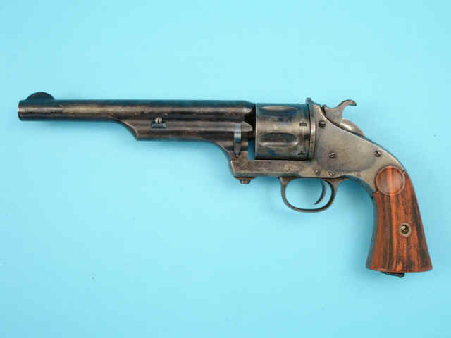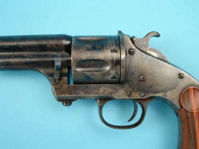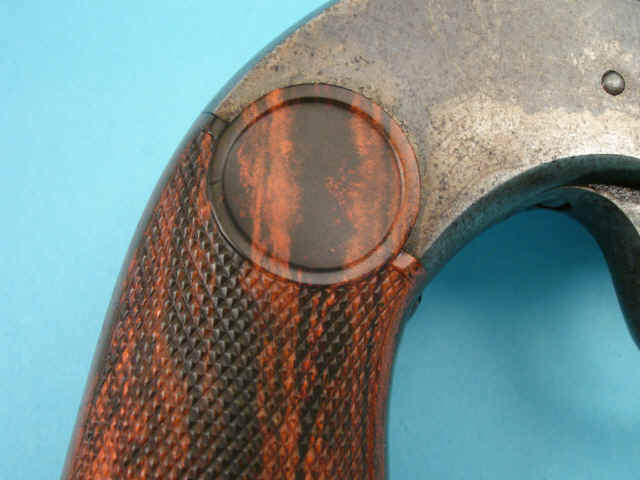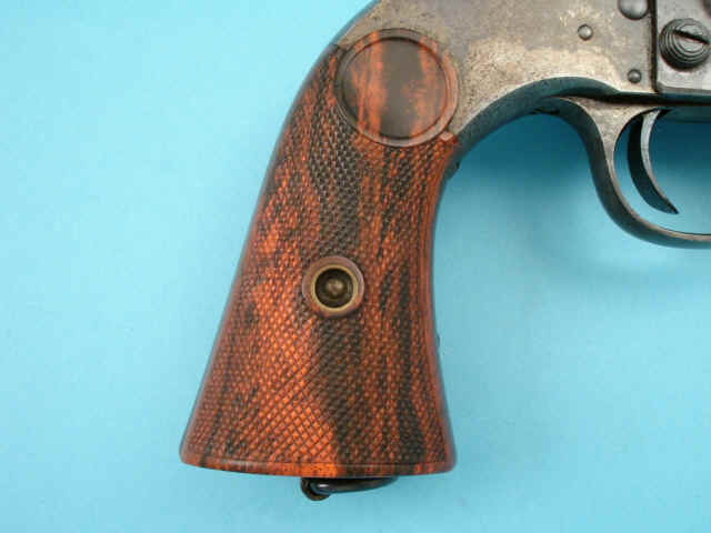 Note: Scarce combination of blued finish, red checkered grips, open top frame, scooped