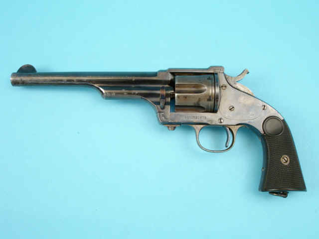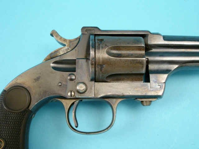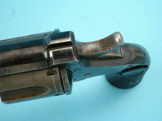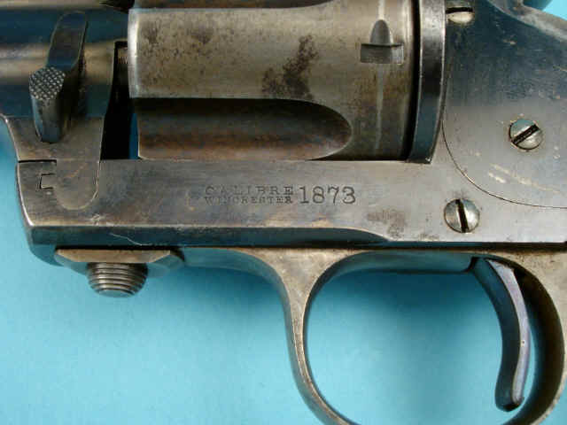 of frame; blued with case-hardened hammer and triggerguard; checkered hard rubber grips.