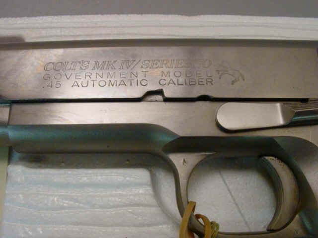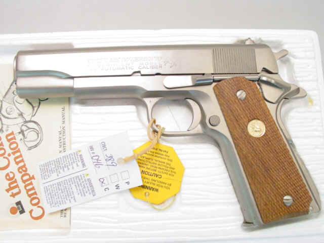 Serial no. 22245B70, .45 ACP, 5-inch barrel. Electroless Nickel finish with checkered Colt medallion grips. Contained in Colt factory carton with Colt Custom Gun Shop label. Instruction manual and the Colt Companion are also included.