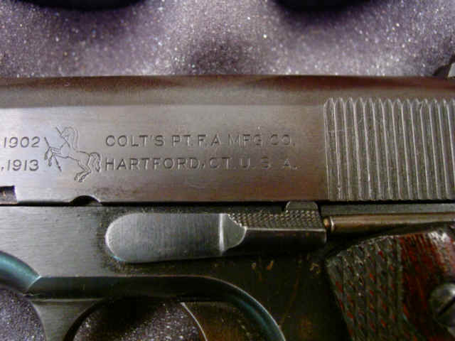Serial No. 613461, .45 ACP caliber, 5-inch barrel. Right side of slide marked MODEL OF 1911.U.S.ARMY. Left side of slide with 1913 patent date. Straight main spring. No finger groove. Blued with checkered walnut grips.