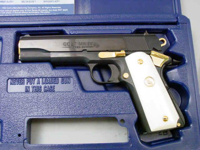 Serial No. FR09388E, .45 ACP caliber, 5-inch barrel. Standard markings. Blued with gold trim and ivory-poly grips. Fixed white dot sights. Together with manual, brochures and extra magazine in factory box and case.