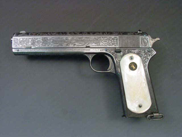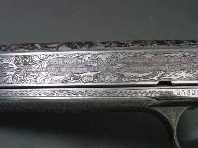 Compare to Model 1902 pistol no. 35751, similarly engraved and inscribed, but for
