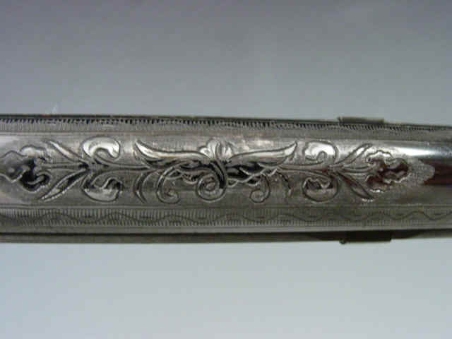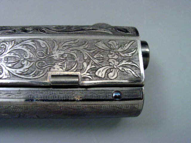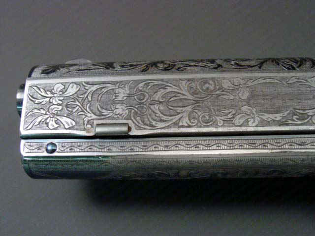blued finish, with case-hardened hammer; profusely scroll and border engraved on slide and