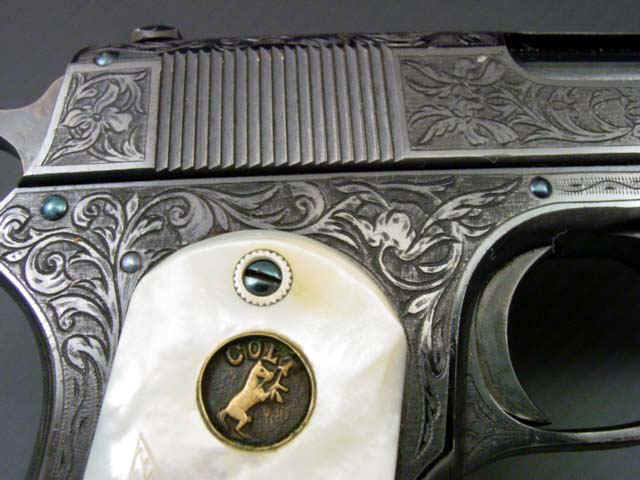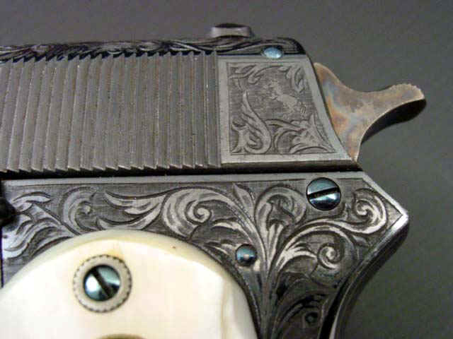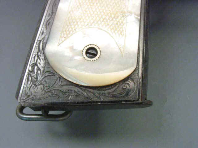 shading through the slide markings. Checkered mother-of-pearl grips with deep set rampant